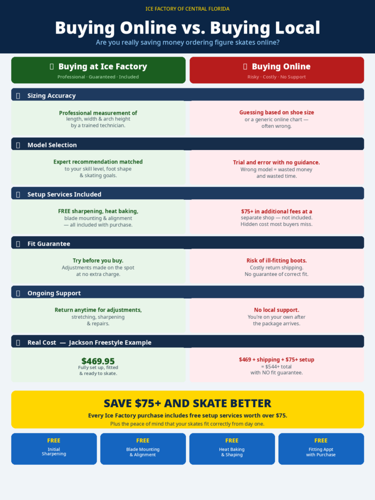 Buying figure skates is not like buying sneakers. The wrong size, width, or boot model can lead to ankle instability, blisters, and stunted skating development. Figure skates run 1 to 1.5 sizes smaller than street shoes, and the width of your foot matters just as much as the length. A boot that is even half a size too large fails to lock the heel in place, forcing the skater to compensate with their ankle — a habit that is difficult to break and can cause injury over time.